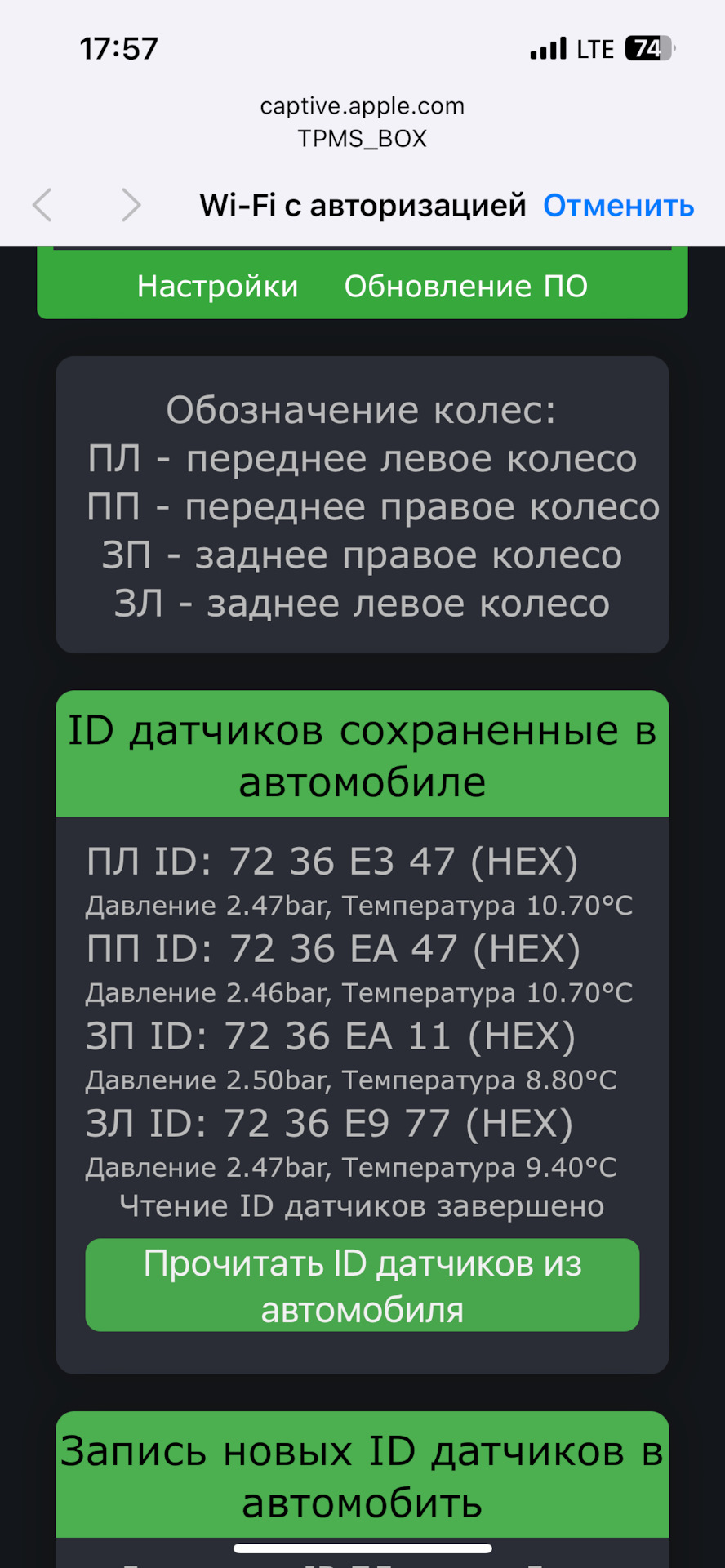 Перепрошить датчики давления в шинах