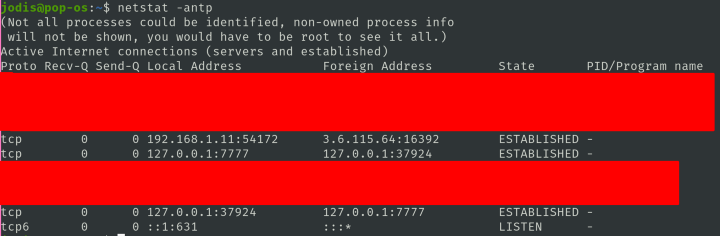 Pop-OS также показывает, что мы подключены к 3.6.115.64, который, как мы видели, является IP-адресом 0.tcp.in.ngrok.io