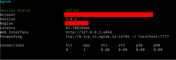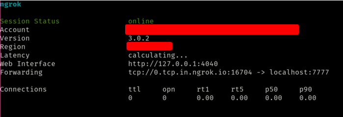 Вы получите окно, подобное этому. Теперь укажите целевой IP и порт для подключения к порту 7777 - 0.tcp.in.ngrok.io и 16704 соответственно.