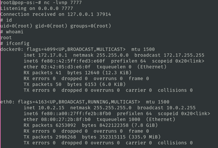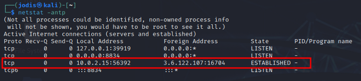 Мы можем видеть из просмотра подключенных портов, что наша машина kali подключена к некоторому 3.6.122.107, который обычно является чем-то на AWS. Этот IP представляет нам соединение через интернет с нашей pop-os машиной, хотя 0.tcp.in.ngrok.io не представлен этим IP.