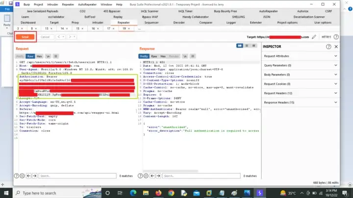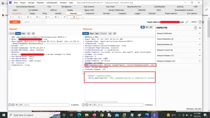 Я обнаружил неправильную конфигурацию API в конечной точке SwaggerUI в одном из веб-приложений в частной программе. Она приводила к утечке токена авторизации в локальное хранилище веб-приложения, которое я использовал для поиска конфиденциальной информации пользователей на сайте. Однако при исследовании запросов с помощью доступа к конечной точке SwaggerUI он выдал мне ошибку "Unauthorized, Full authentication is required to access", и одна вещь, которая привлекла мое внимание, это заголовок WWW-Authenticate с начальным значением Bearer в ответе, что означает, что будет использован заголовок запроса авторизации с начальным значением Bearer.