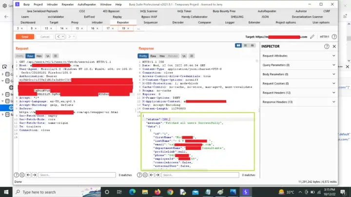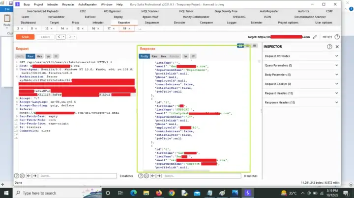 Я начал искать токен в запросах, но не нашел его, тогда я начал искать токен в cookies, localstorage и sessionstorage и обнаружил, что токен авторизации хранится в localstorage приложения. Я скопировал токен и использовал его в запросе, затем изменил {serviceIdentifier} на 1 и смог перечислить список пользователей, который содержал данные о сотруднике: имя, фамилию, id сотрудника, email, название отдела и номер телефона.