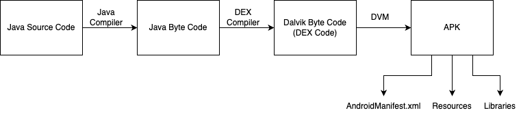 Все мы знаем, что после создания приложения Android создается файл .apk. Вы когда-нибудь задавались вопросом, что именно представляет собой этот .apk-файл? Ну, файл .apk - это не что иное, как zip-файл исходного кода, который содержит все ресурсы, dex-коды, активы, файлы манифеста и т.д. На следующей схеме показано, как исходный код Java преобразуется в файл APK.