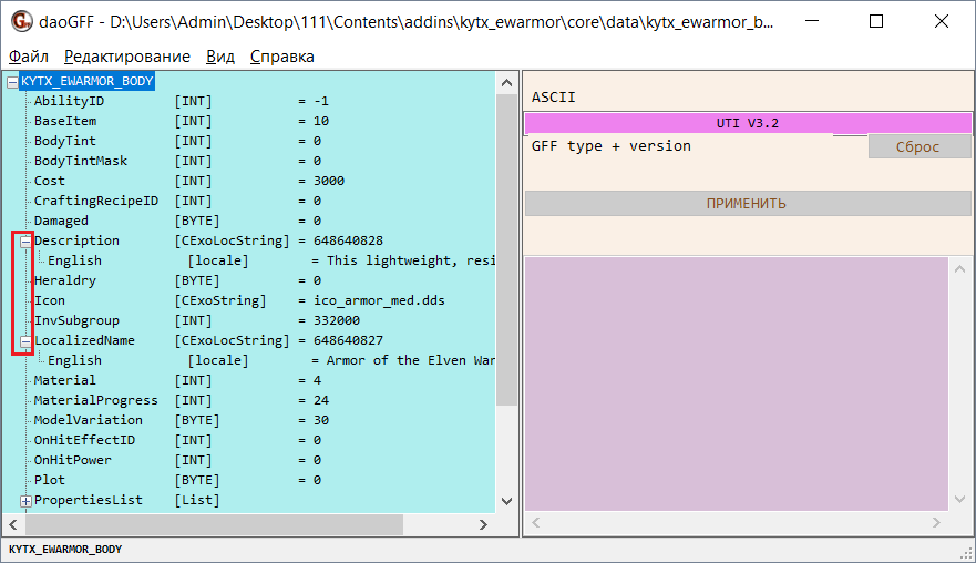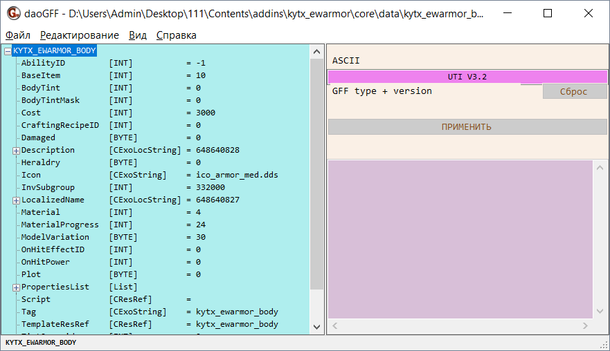 Файлы GFF открываются и редактируются с помощью специальной программы daoGFF. Вы можете запустить как оригинальную версию программы, так и русифицированную. DaoGFF умеет открывать только файлы GFF, что понятно из её названия. Чтобы открыть файл, просто перетащите его в окно программы. Внимание! Одновременно в программе может быть открыт только один файл! Если файлы нужно сравнить, то запустите две и более копии программы.