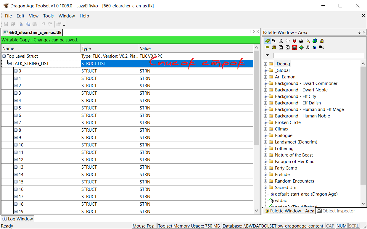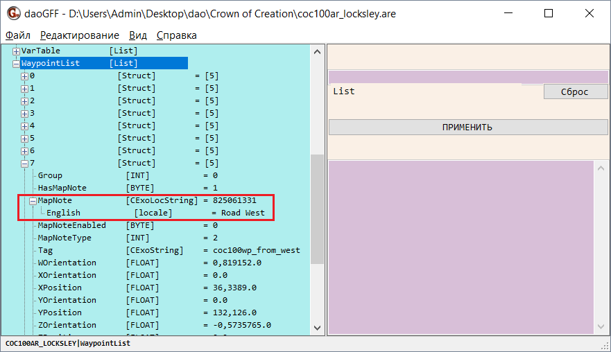 Автор может добавить на карту (включая мини-карту) специальные метки, названия которых появляются при наведении на них. Метки на локациях есть всегда, однако не всегда они видимые. И это тоже нужно проверить. Раскройте строку WaypointList, она самая последняя в файле, в ней вы увидите список меток на локации, каждая метка обозначена цифрой. Раскрыв строку с цифрой, вы должны найти и раскрыть строку MapNote. Если строка English будет пуста, ничего не делайте, проверяйте следующую строку и так далее. Когда в строке MapNote вы найдёте текст, то перенесите его в файл *.tlk точно так же, как делали до этого. А строку English с текстом в файле удалите.