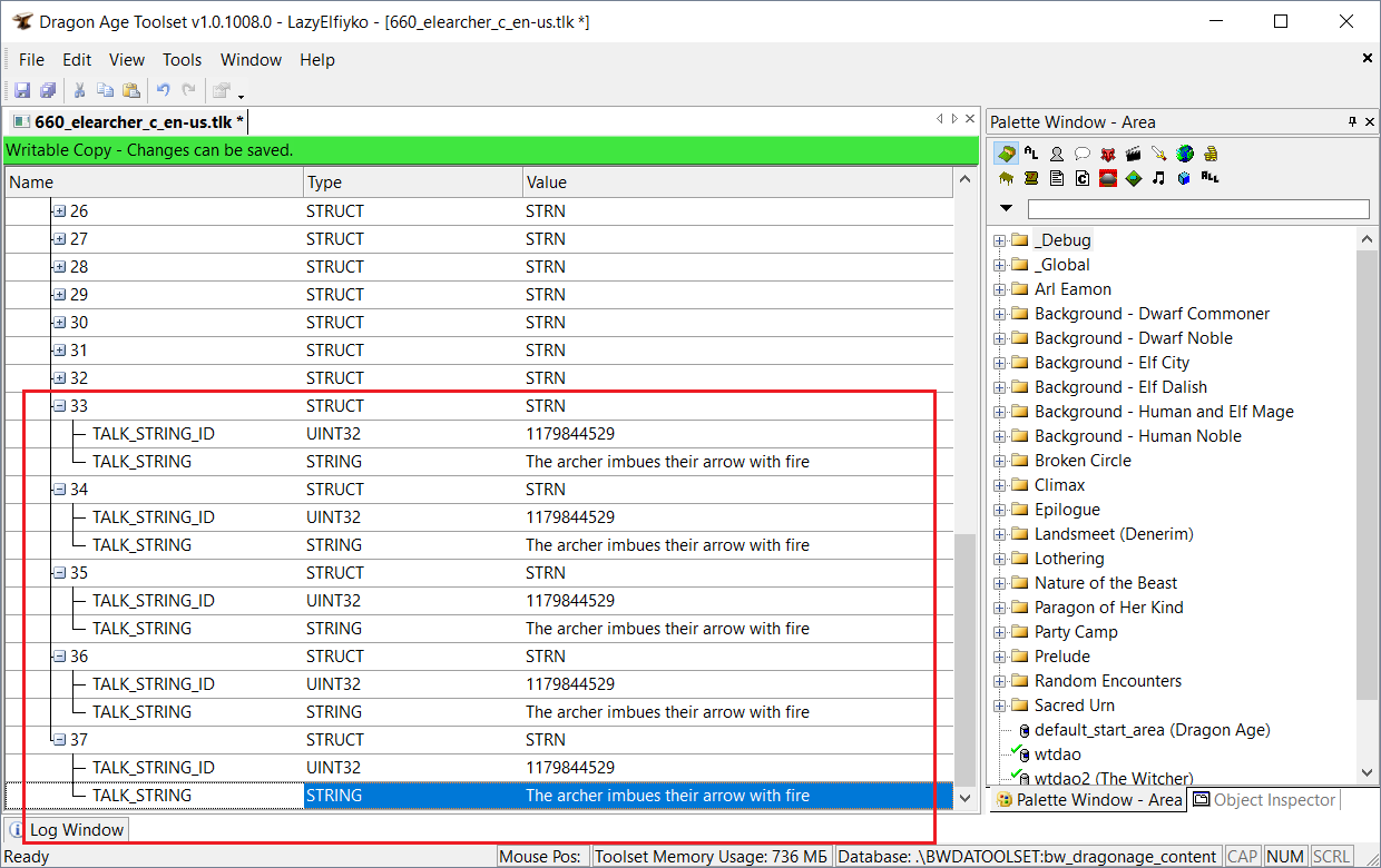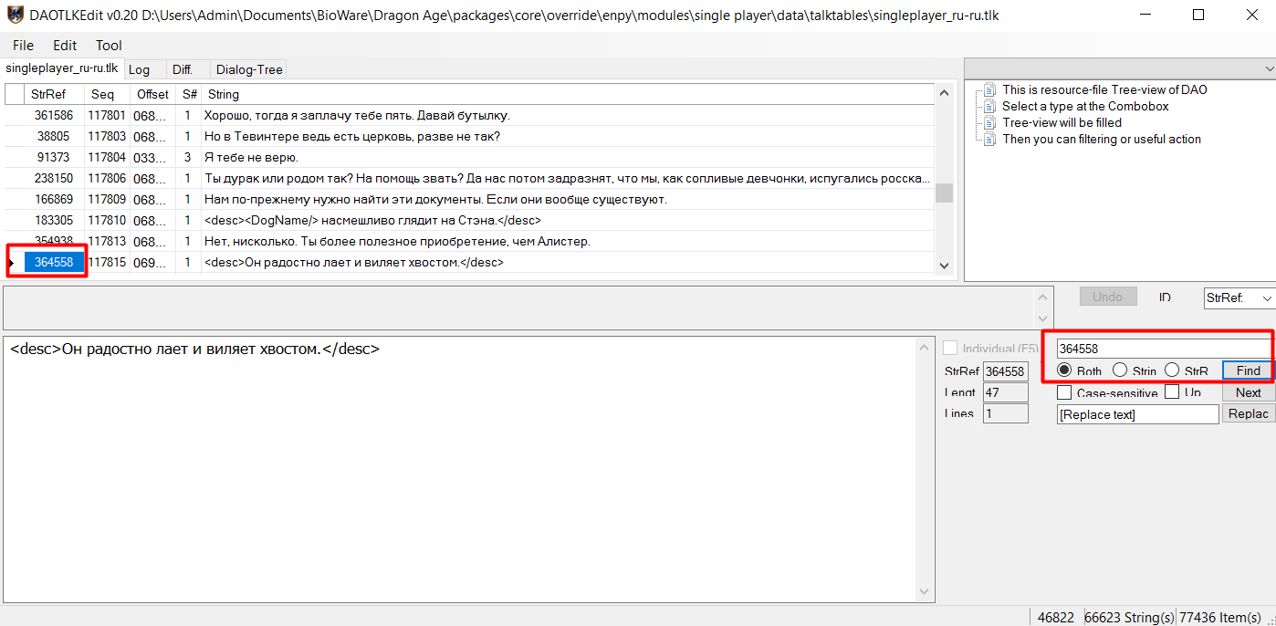В этот *.tlk занесён текст только из тех файлов, которые дальше оригинальной кампании не встречаются. В основном, это как раз текст из всех диалогов оригинальной кампании. В Тулсете я открою диалог и скопирую первый ID, который связан с текстом, это будет 364558. Скопированный ID вставляю в программу DAOTlkEdit, нажимаю на кнопку Find и смотрю на результат. Да, совпадение найдено: