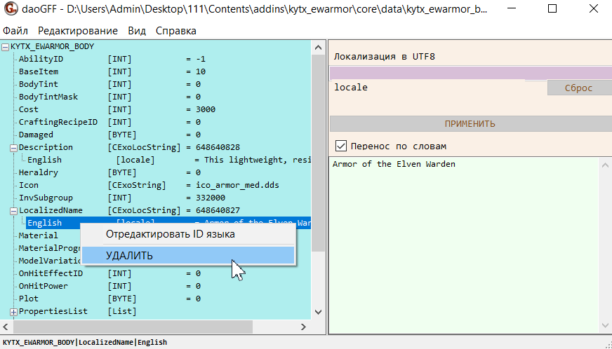 Теперь текст в файле GFF надо зачистить. Делается это для того, чтобы игра брала текст из файлов *.tlk, а не из файлов GFF. Выделите строку English под строкой LocalizedName. Нажмите на неё ПКМ и выберите в контекстном меню пункт "УДАЛИТЬ", подтвердите своё намерение.