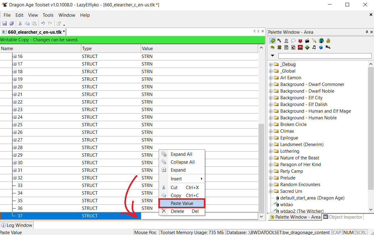 Теперь в правом столбце Value впишите всем новым строкам значение STRN. Ctrl + C и Ctrl + V вам помогут в этом деле. Если не вписать значение STRN, Тулсет вылетит во время сохранения *.tlk.
