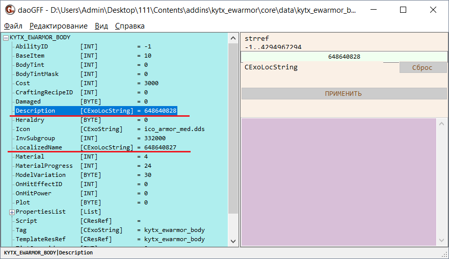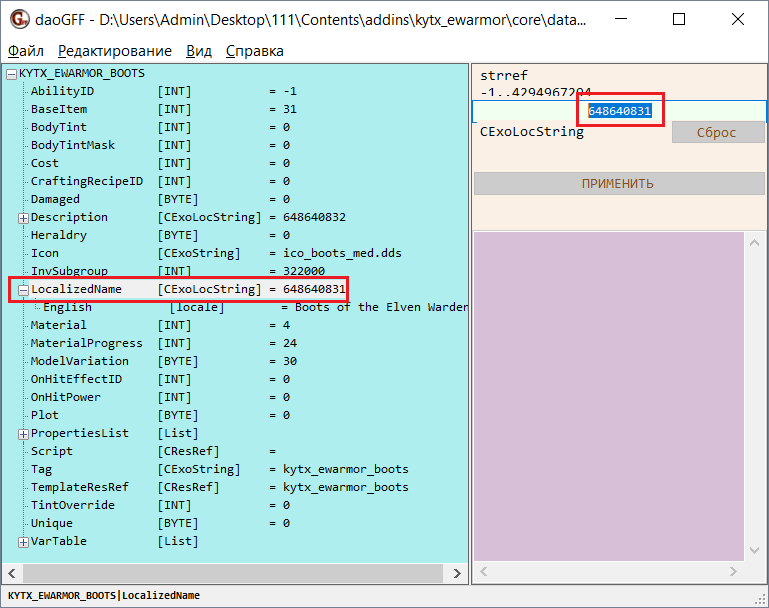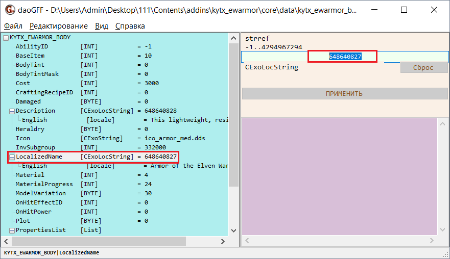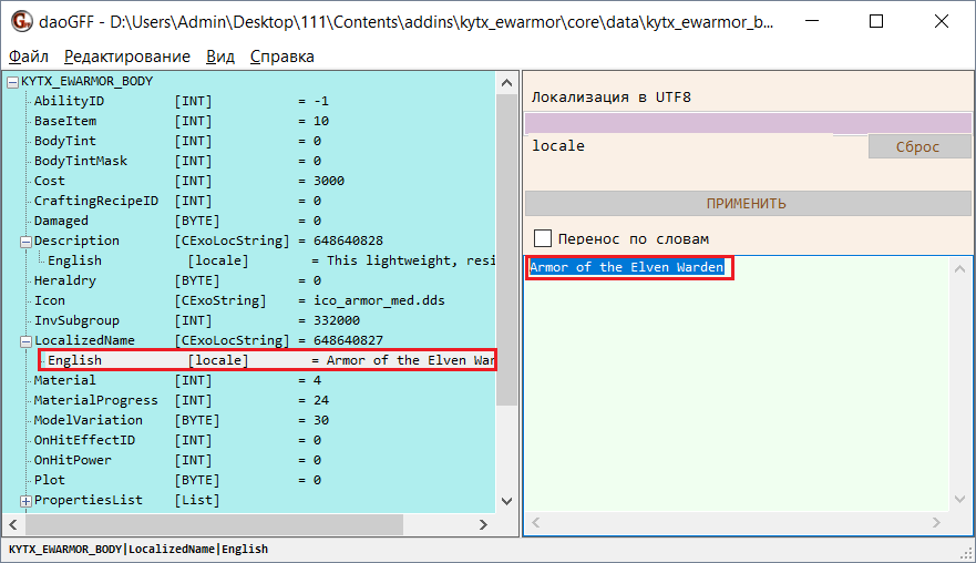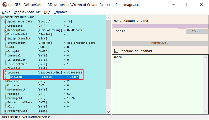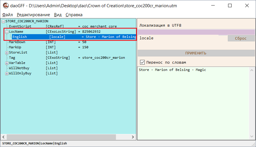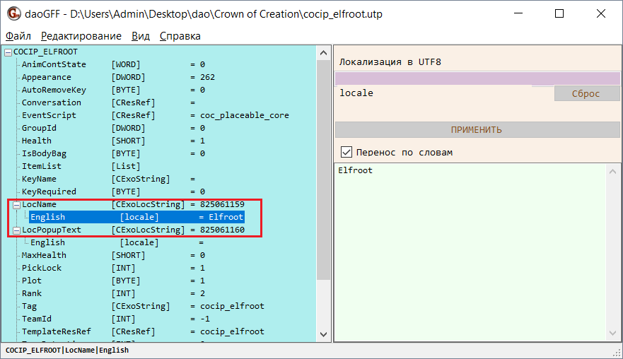 Вернитесь к программе daoGFF и выделите строку English под строкой LocalizedName. В правой части окна программы отобразится текст названия.