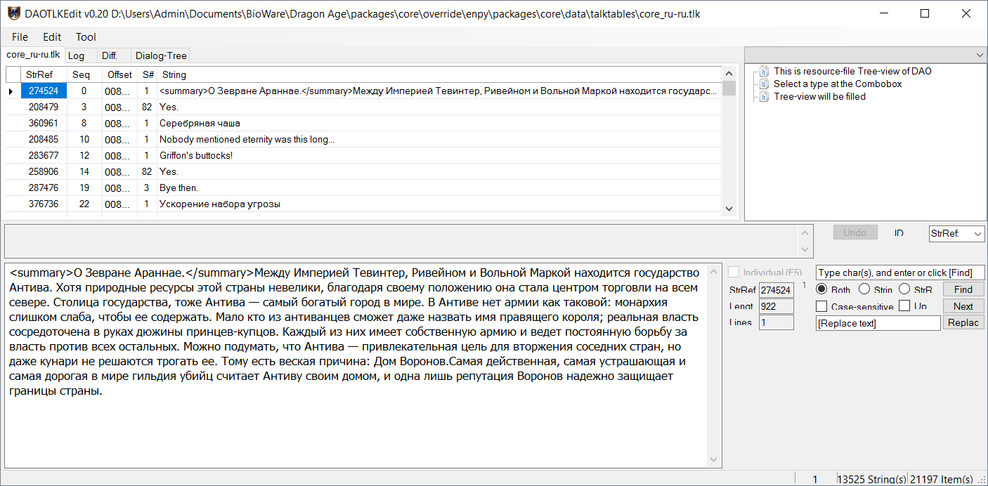 Допустим, что на первых порах вы будете путаться в длине ID. В этом случае можно устроить небольшую проверку. Чтобы понять, есть ли ID из мода в каком-либо корневом файле *.tlk или нет, понадобится программа DAOTlkEdit. Запустите её. Какой из корневых файлов открывать в программе, подскажет сам мод. Я разбираю процесс перевода на моде на доспехи, значит, мне нужно открыть файл core_ru-ru.tlk, который располагается по пути: