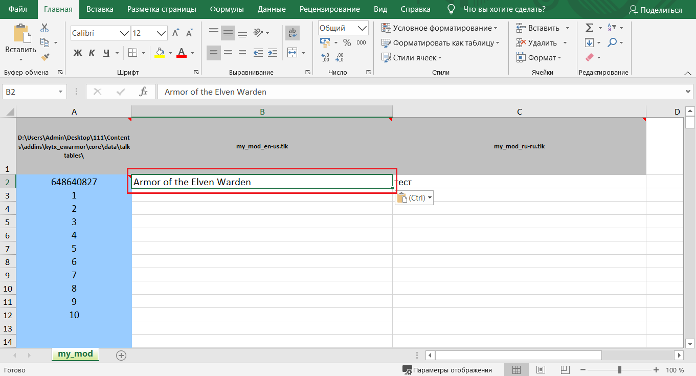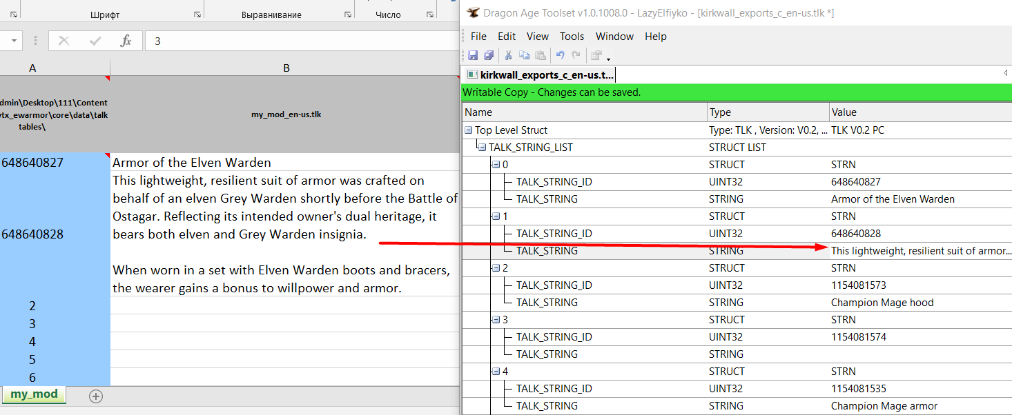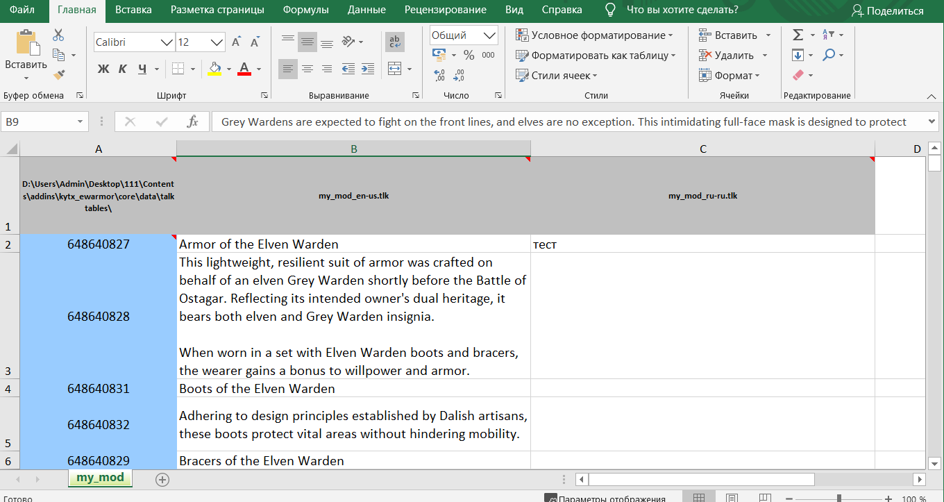 В Excel необходимо открыть файл my_mod.xls, прилагающийся к программе Translator Toolkit. Что касается Тулсета, то нужно скопировать *.tlk из какого-либо мода и открыть его в программе. У меня это kirkwall_exports_c_en-us.tlk, из мода Kirkwall Exports.