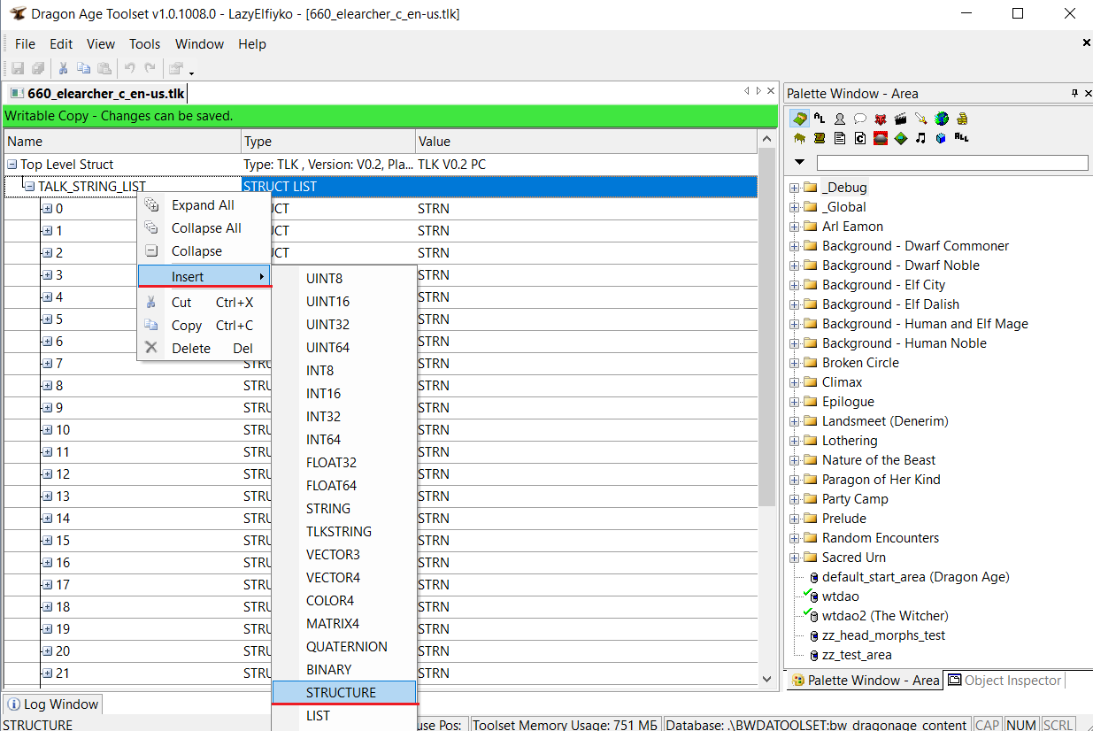 На скриншоте выше выделена строка, содержащая список всех строк в файле, поэтому именно сюда мы должны их добавить. Нажмите на строку TALK_STRING_LIST ПКМ и выберите пункт в контекстном меню Insert – STRUCTURE.