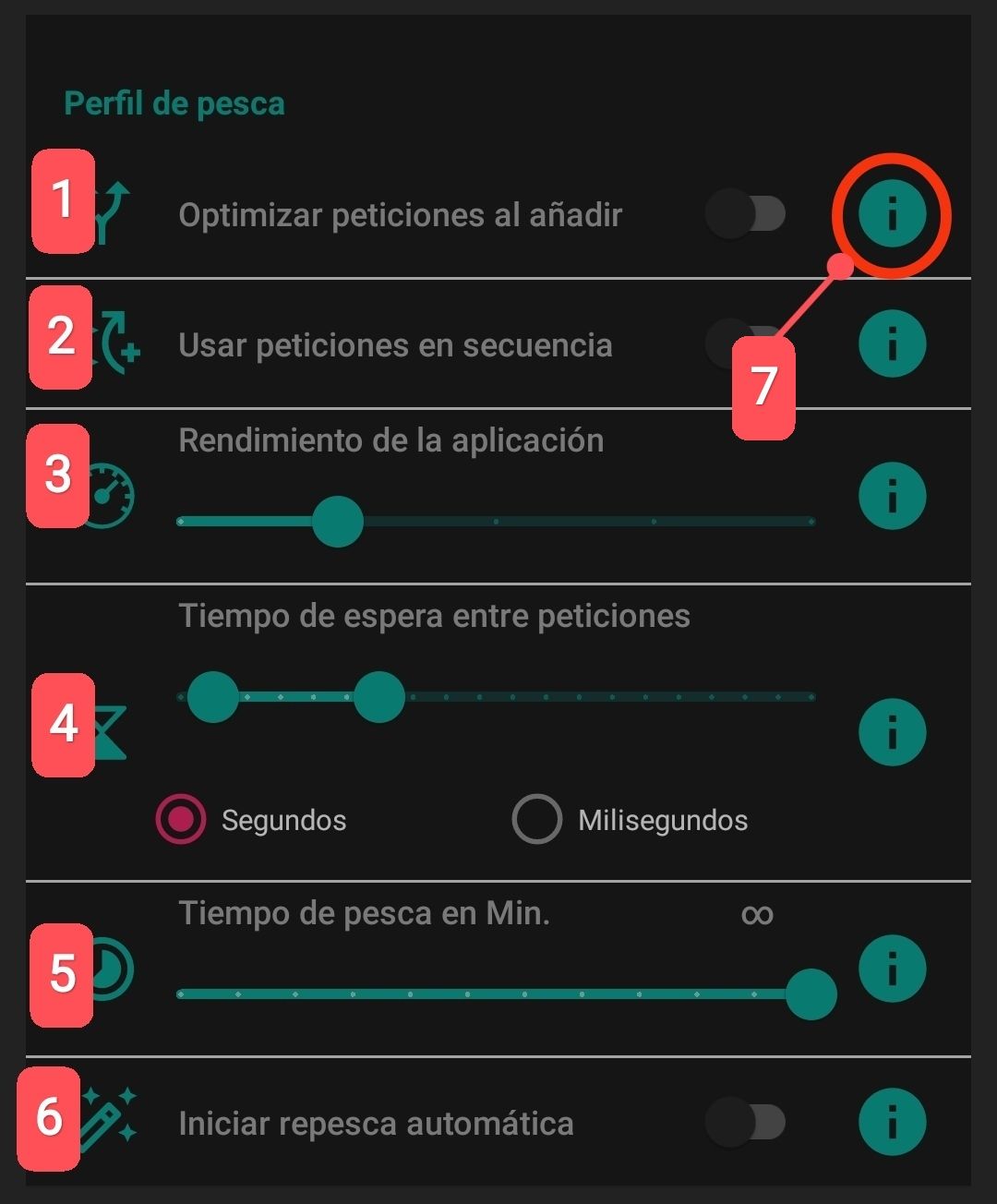 Al estar activo este ajuste la aplicación realiza las peticiones de forma secuencial formando una cola de peticiones con un lapso de tiempo variable entre cada petición, el tiempo se configura en el ajuste (4). Cuando esta activo el ajuste (3) se oculta.