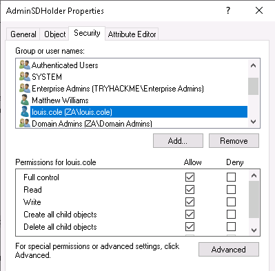 Одним из таких шаблонов является контейнер AdminSDHolder. Этот контейнер существует в каждом домене AD, и его список управления доступом (ACL) используется в качестве шаблона для копирования разрешений для всех защищенных групп. Защищенные группы включают привилегированные группы, такие как Domain Admins, Administrators, Enterprise Admins и Schema Admins. Если вам нужен полный список групп, найти их можно здесь.