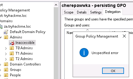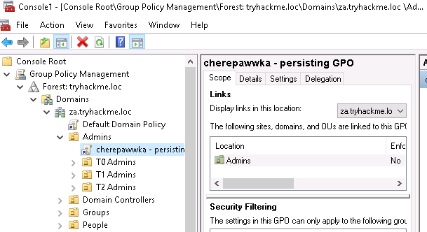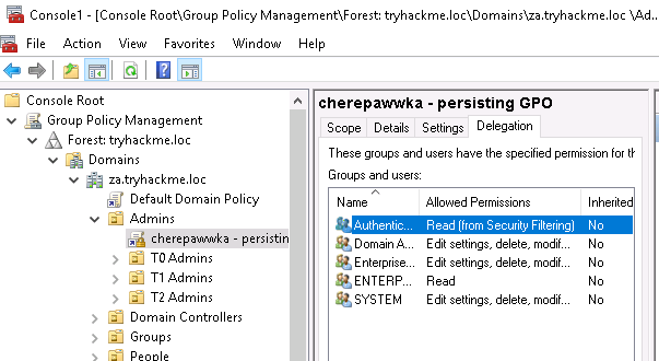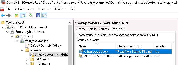 Теперь, когда мы знаем, что наше закрепление успешно, пришло время убедиться, что синяя команда не может просто удалить наши "закладки". Вернёмся к окну MMC, нажмём на свою политику, а затем перейдем на вкладку Delegation: