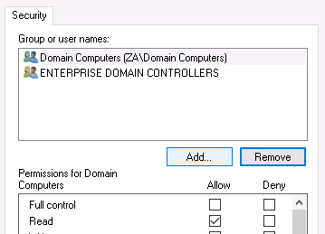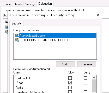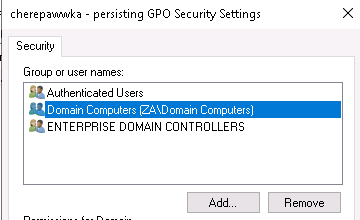 Мы могли бы заменить Authenticated Users на Domain Computers, чтобы гарантировать, что компьютеры по-прежнему смогут читать и применять политику, но запретить любому пользователю читать политику. Давайте сделаем это для проверки. Но после этого пути обратно нет:
