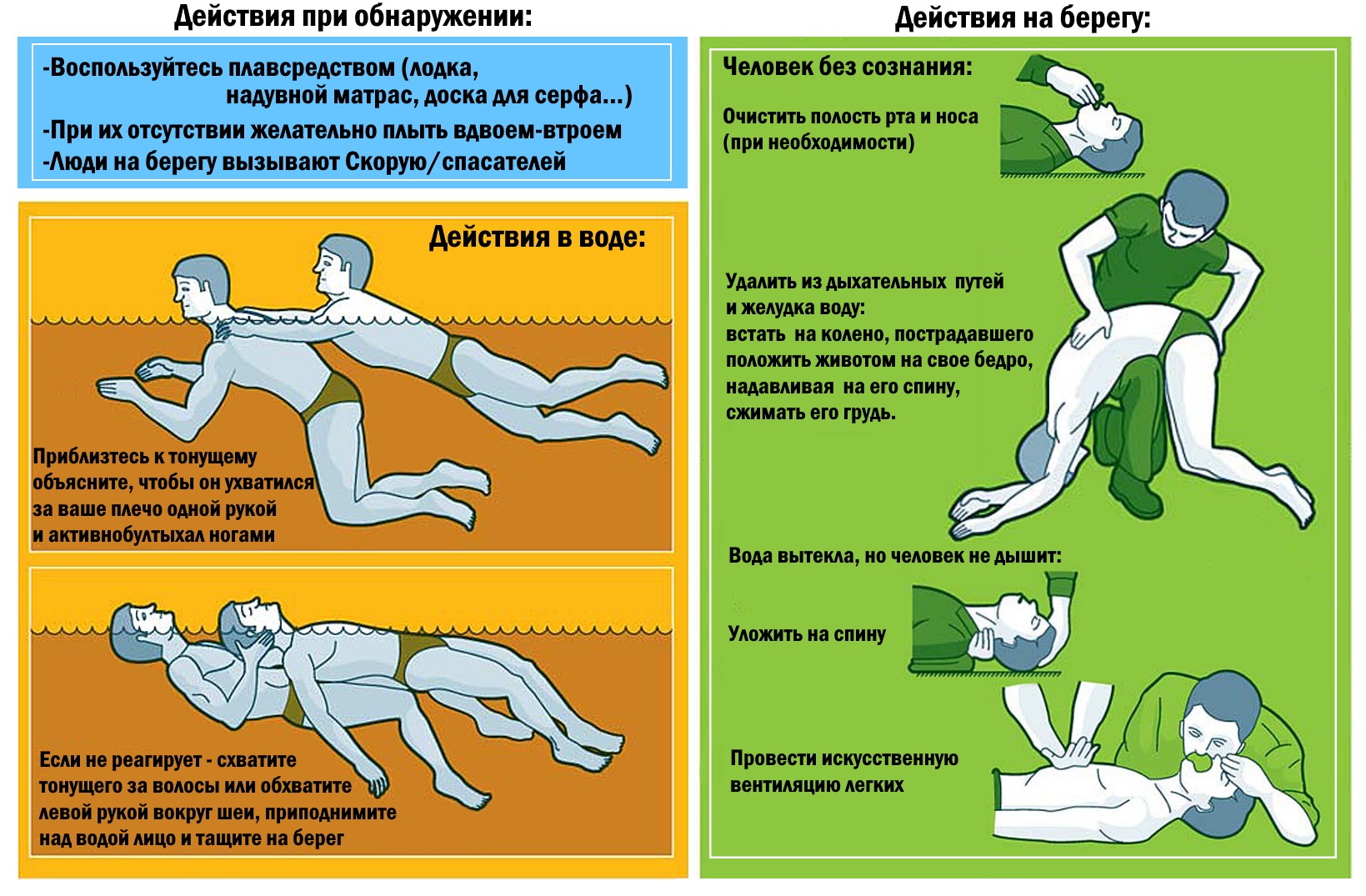 Захлебнувшемуся человеку нужно, прежде всего, освободить лёгкие от воды. Для этого достаточно положить его животом на своё колено.
