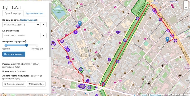 Sight Safari умеет прокладывать пешие маршруты так, чтобы пешеход обязательно увидел какую-нибудь местную достопримечательность. Конечно, при условии, что рядом есть что достопримечать. При этом программа гарантирует, что маршрут будет не сильно длиннее кратчайшего (максимум — в два раза).