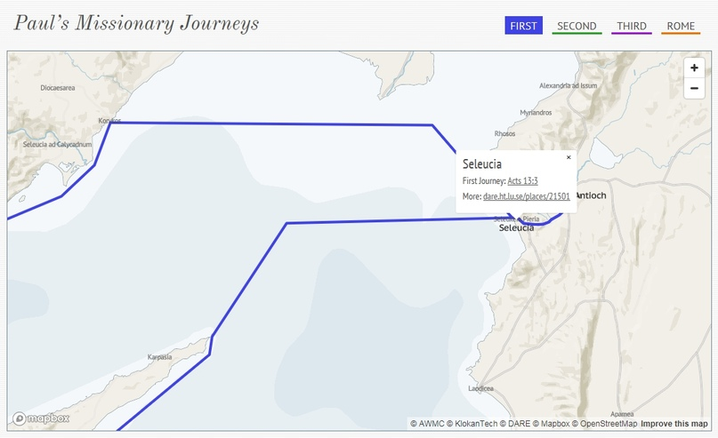 На любую из множества остановок апостола можно кликнуть — во всплывающем окне появляется ссылка на Новый Завет и ссылка на более подробную информацию, содержащуюся в цифровом атласе Римской империи.