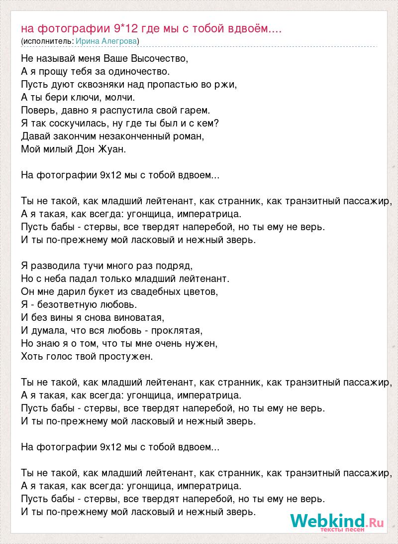 Текст Ирина Аллегрова-Фотография 9 на 12 . На моем столике, в маленькой спаленке, Среди игрушек духов и помад . Есть фотография юного странника: Смотрит мне в душу улыбчивый взгляд . Фотография девять на двенадцать, С наивной подписью «на память» .