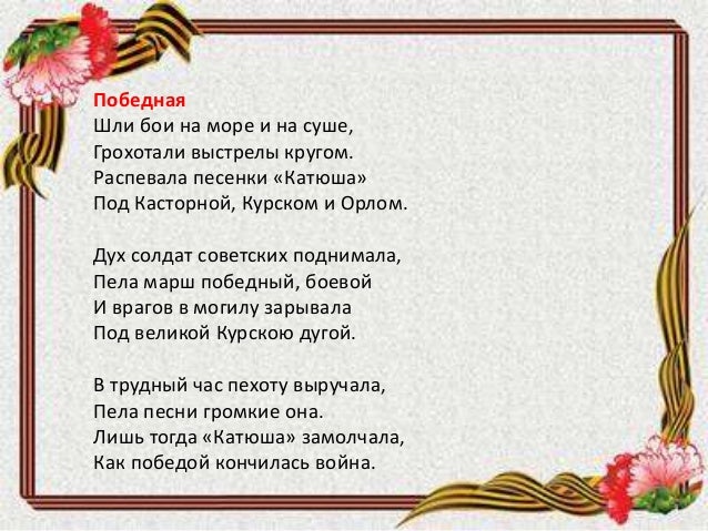 Пусть он вспомнит девушку простую, Пусть услышит, как она поет, Пусть он землю бережет родную, А любовь катюша сбережет . Расцветали яблони и груши, Поплыли туманы над рекой . Выходила на берег катюша, На высокий берег на крутой . Категория : Детские песни » Песни к 23 . . .