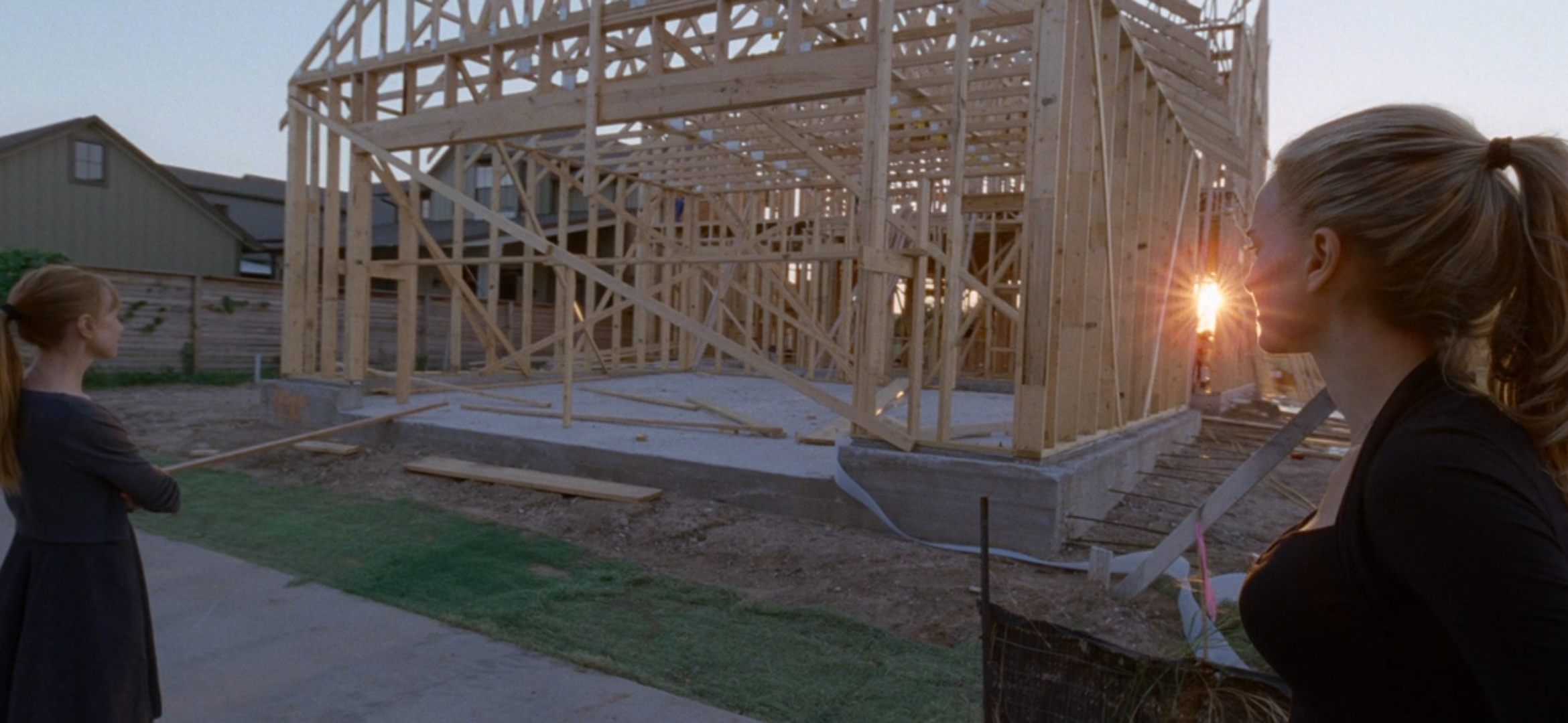 Персонаж Райана Гослинга (композитор, сочиняющий популярные песни), и персонаж Руни Мары (тоже музыкант) влюбляются друг в друга. Однако есть у Мары и другой фаворит, богатый продюсер в исполнении Фассбендера. Тот – нестабильная натура, мечется между образом хитрого змея-искусителя и бескорыстного благодетеля, который пытается построить счастье персонажу Натали Портман, не требуя взамен буквально ничего. Но счастья с помощью денег построить по спроектированным чертежам не получится, что визуально олицетворяет каркас недостроенного дома, напоминающий скелет.