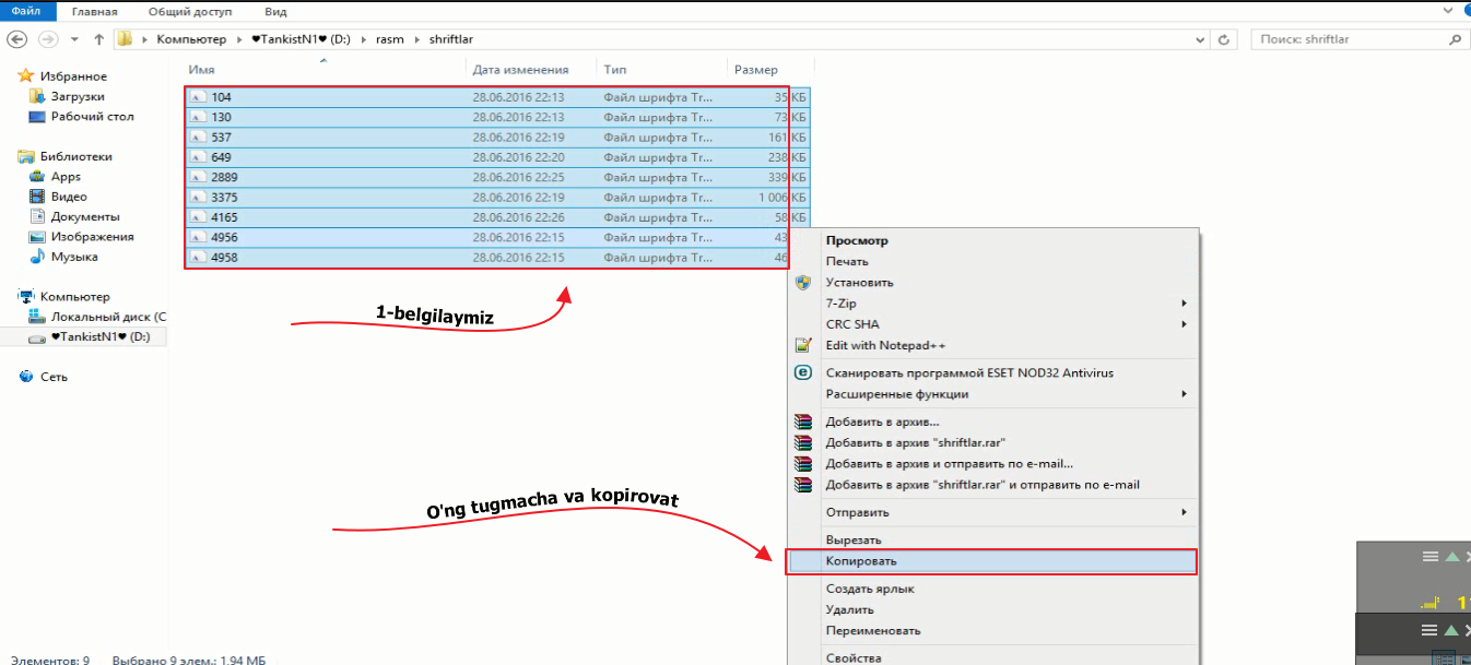 Photoshopda chiroyli va o'ziga hos shriftlarda yozuv yozmoqchi bo'lsangiz-u o'zingizga yoqadigan shriflarni topolmasangiz internetdan o'zingizga yoqadigan shriflarni yuklab olishingiz va uni photoshopda ishlatishingiz mumkin. Buning uchun bizga internetda "шрифты для фотошопа" so'zini yozib izlaymiz va "ttf" formatdagi shriftni yuklab olamiz. So'ng yuklab olgan faylingizni belgilab kopirovat tugmasiga bosasiz.