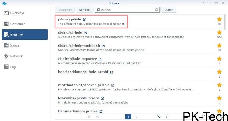 So launch the Synology Package Centre, search for docker and click on the Install button. Next, launch the Docker app, click on Registry from the left-hand pane and search for pi-hole. You should see the official Pi-hole at the top of the list. Double-click on the official Pi-hole image to download it to your Synology.