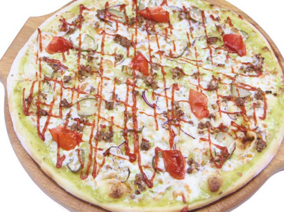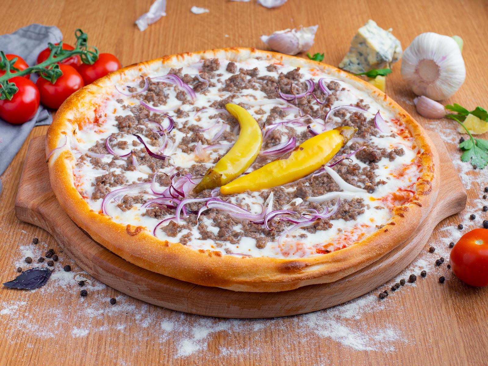 Сливочная пицца Болоньезе . Без томатов, на белом соусе .