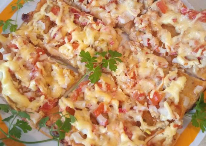 Пицца со сливочным соусом, крабовыми палочками и помидорами