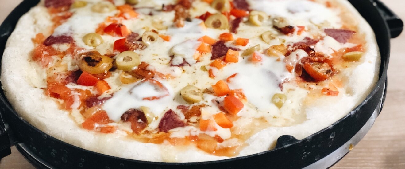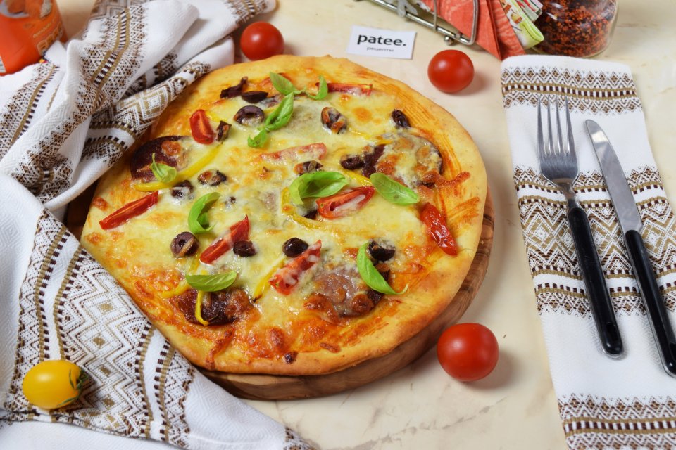 Рецепт: Пицца с салями, маслинами, оливками и сыром на . . .