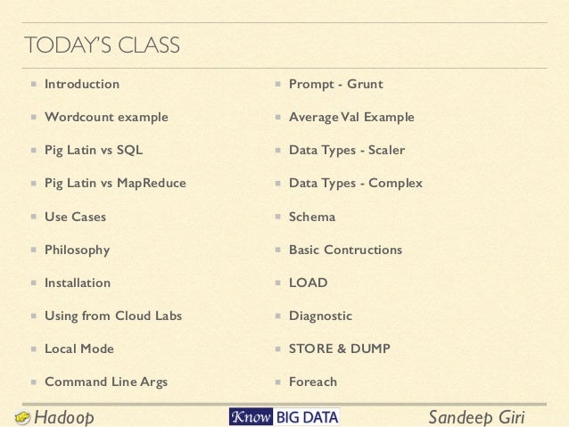 Перевести · Pig Latin syntax statement: cat path [path …] UPPERCASE. lowercase. In general, uppercase type indicates elements the system supplies. In general, lowercase type indicates elements that you supply. (These conventions are not strictly adherered to in all examples.) See Case Sensitivity. Pig Latin statement: a = LOAD 'data' AS (f1:int); LOAD, AS - Pig …
