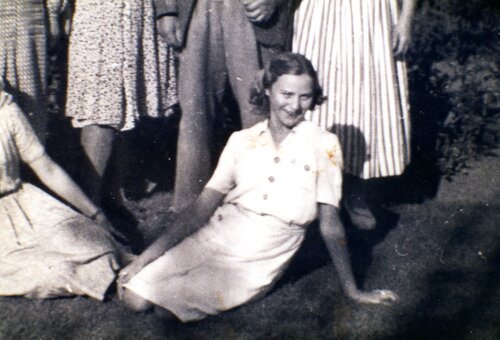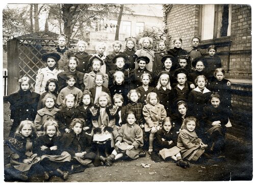 Tre piger poserer til ære for fotografen på Bullerupgyden (Bullerupvej 21) . Fotograf: Ukendt (Seden Sogns Lokalhistoriske Arkiv)