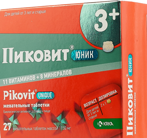 Пиковит Юник жевательные таблетки №27 и №54, 3+ Пиковит Юник жевательные таблетки в уникальной форме медвежонка являются источником 11 витаминов и 8 минералов для детей 3 лет и старше . Не содержат красителей и консервантов, искусственных подсластителей и ароматизаторов . Подробнее » Не является лекарственным средством . Препараты Пиковит 1+