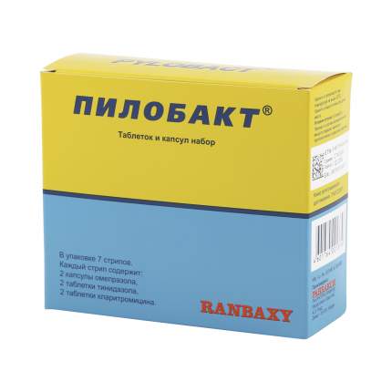 Пилобакт - комбинация препаратов, предназначенная для комплексного лечения язвенной болезни желудка . Проявляет выраженную активность в отношении Helicobacter pylori . Действующее вещество Омепразол (omeprazole), тинидазол (tinidazole), кларитромицин (clarithromycin) . Форма выпуска и состав Выпускается в виде комбинированного набора .