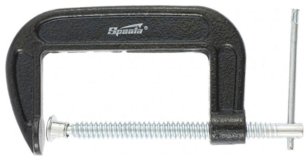 Pince SPARTA en forme de G 200 millimètres; le cadre de la pince est recouvert de vernis coloré. La vis de serrage avec une pince spéciale et un gros filetage sans fin vous permet de fixer des objets en toute sécurité.