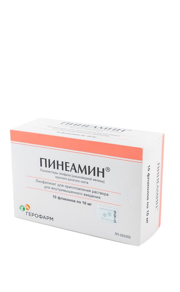 Форма выпуска Пинеамин - лиофилизат для приготовления раствора для внутримышечного введения 10 мг . Флакон по 5 мл, по 5 флаконов в упаковке . По 1 или 2 упаковки в пачке . Состав