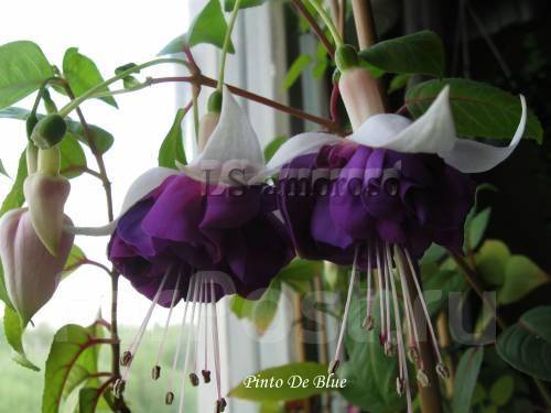 Пинто де блю — полуампельная форма фуксии . Бутоны продолговатые, чашелистики белые с легким светло-розовым напылением . Юбочка необычного синего цвета .