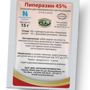 Противоглистное средство Пиперазин выпускается в двух видах: белый кристаллический порошок - для животных, расфасованный в пакетики по 2 и 150 г . Продается в ветаптеках .