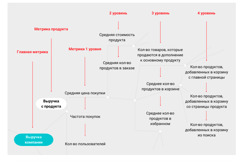 Уровни иерархии можно расписывать настолько глубоко, насколько необходимо, вплоть до конкретных показателей, которые мы замеряем в продуктах.