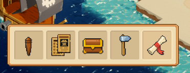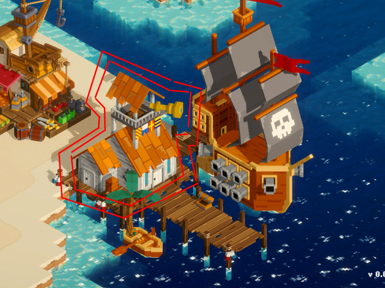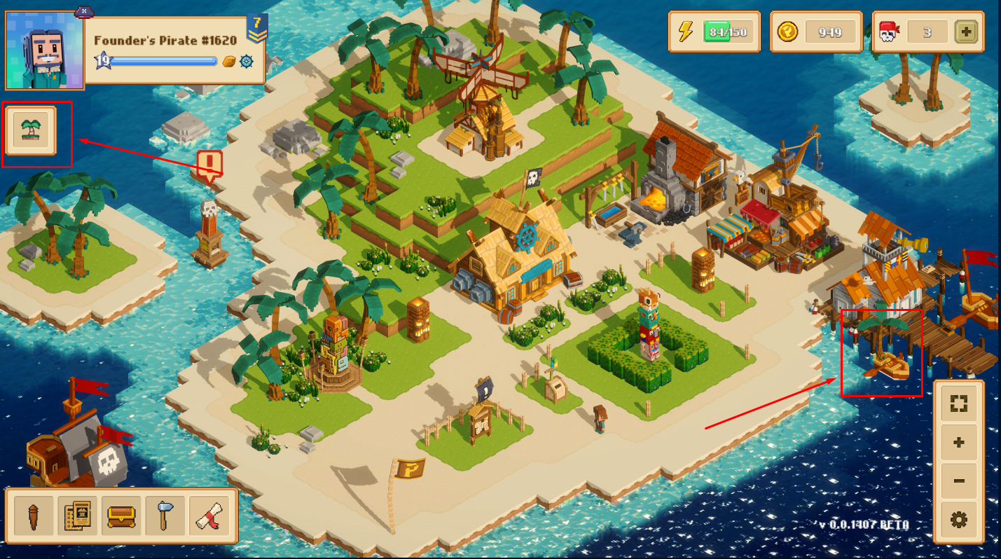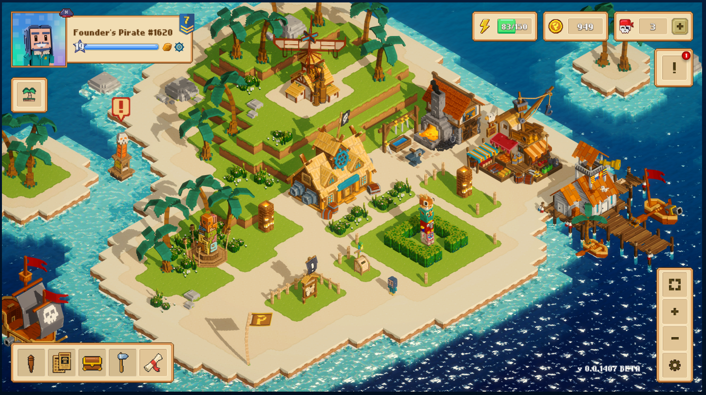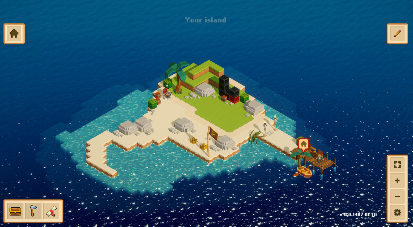 Игра встречает нас небольшим воксельным островом с кучей пиратских построек. Каждая постройка чаще всего дублирует UI кнопку ведущую к конкретным действиям.