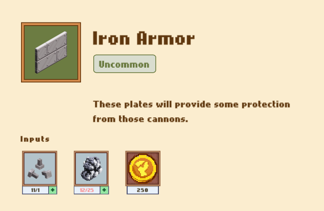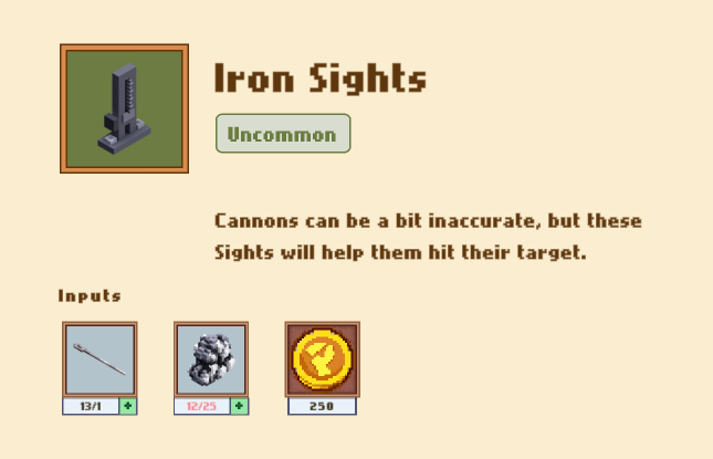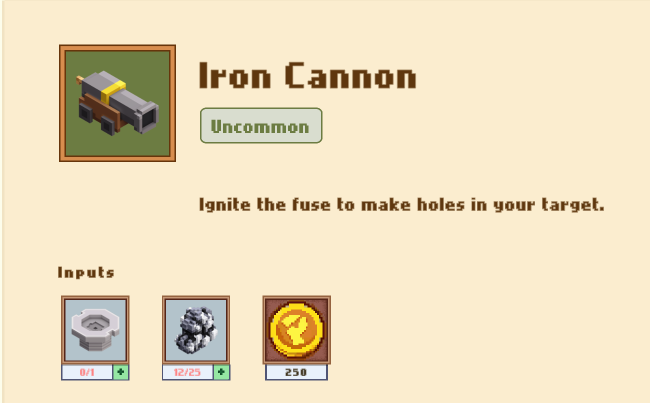25 железных самородков + пушечный тыльник и немного золота за работу, и пушка готова. Пушка в бою дает вам дополнительную карту :