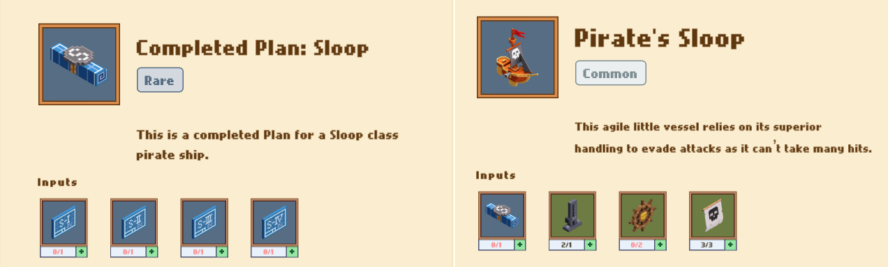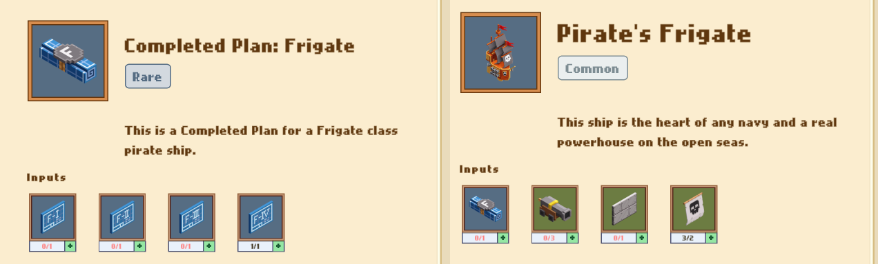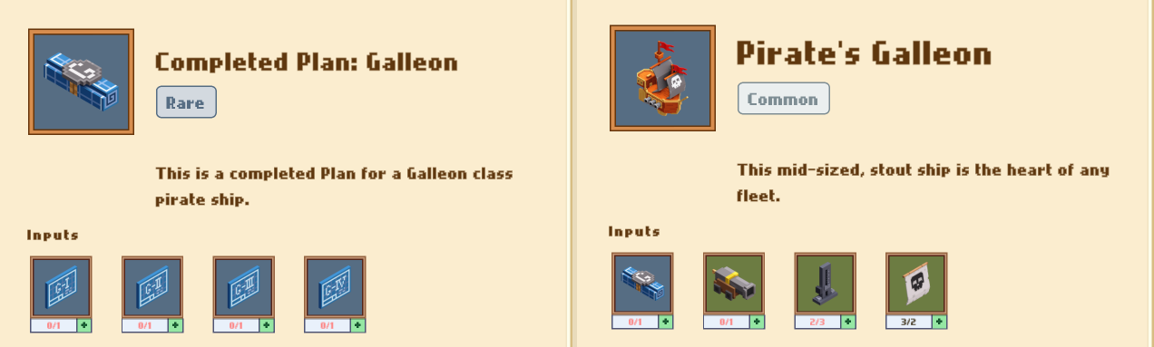 НАПРИМЕР: мы хотим собрать корабль, галеон. По рецепту который доступен нам в столе крафта мы можем посмотреть ингредиенты....