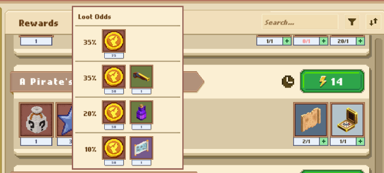 Квесты: Квесты сжигают ту самую энергию аккаунта, взамен выдавая регулярный ( гарантированный ) дроп + регуляр опыт пирата + рандомный лут из лутлиста.