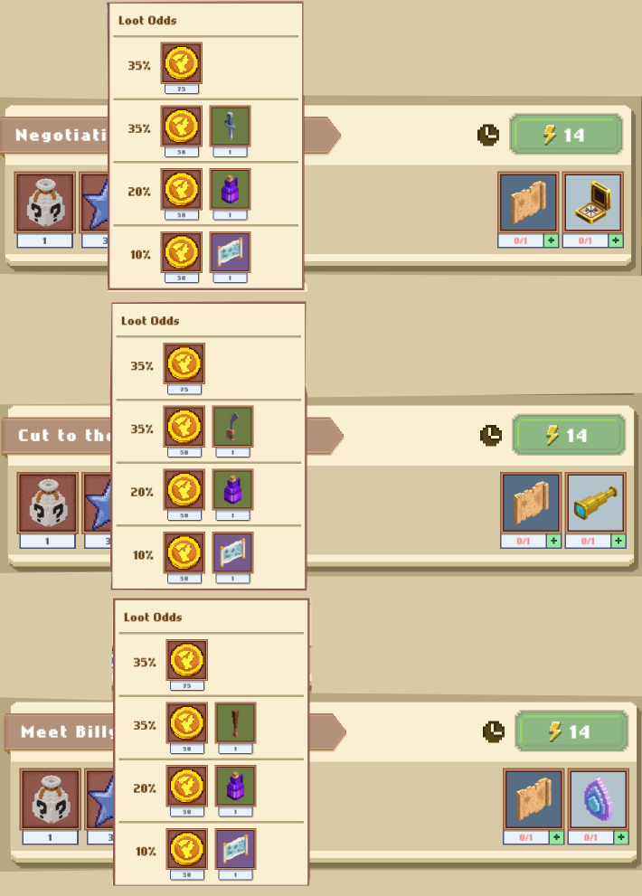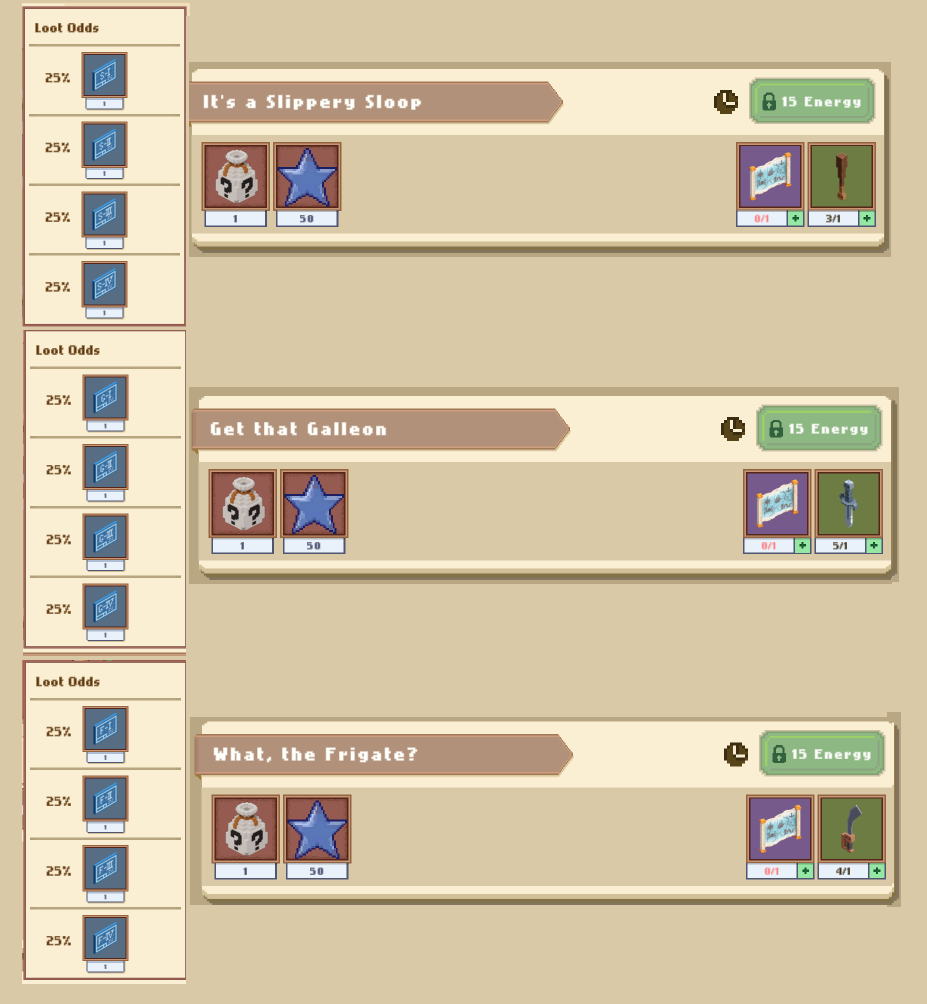 Каждый квест требует 14 энергии, и Тир2 айтемы для старта, которые часто падают с сундуков с морских боев, и при наличии ресурсов первого тира ( дерево/железо/хлопок) легко добываются в квестах.